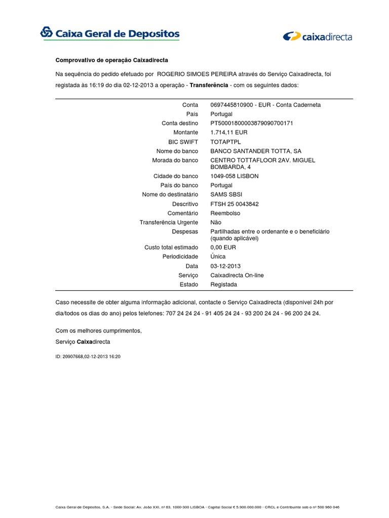 registada s 16:19 do dia 02-12-2013 a operao - Transferncia - com os seguintes dados: