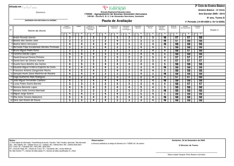 (assinatura com selo branco ou carimbo) Pauta de Avaliação 1º Período (14-09-2009 a 18-12-2009)