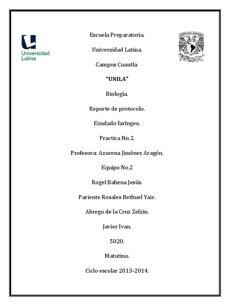 2.mx/search?q=exudado+faringeo&bav=on. Conclusión. Página 9 .47008514.org/wiki/Exudado_far%C3%ADngeo https://www. encontramos que el alumno al quien se le tomaron las pruebas esta completamente sano solo se encontraron fibras vegetales.google. los guantes de látex para no mancharle las manos con los reactivos y se desecharon correctamente en el bote rojo de residuos peligrosos.wikipedia.mx/archivos/analisis%20clinicos/microbiologia/P059%20EXUDADO%20%20FARINGEO. En conclusión desde el punto de vista de la ciencia: Aprendimos a hacer un exudado faríngeo siguiendo las indicaciones y procedimientos de la maestra tomando en cuenta las normas de bioseguridad para no contagiarnos de alguna enfermedad que presente el paciente además. En esta práctica los residuos que se produjeron fueron los 3 hisopos con los que utilizamos para la toma de muestra.1 Cebolla Cristal violeta.&bvm=bv.r_qf.d.org/parent/en_espanol/medicos/labtest11_esp.com/doc/7773233/Exudado-faringeo http://www.sonilaboratorio.eWU&bi w=1241&bih=582&pdl=300&um=1&ie=UTF8&hl=es&tbm=isch&source=og&sa=N&tab=wi&ei=kUihUeWxK4W68ASc5oCgCg http://kidshealth.html http://es.com/Ciencia/Exudado-Faringeo/293879. Manejo y Disposición de Desechos. Bibliografía http://es.com.scribd.html http://clubensayos.r_cp.or.pdf Universidad Latina.com.