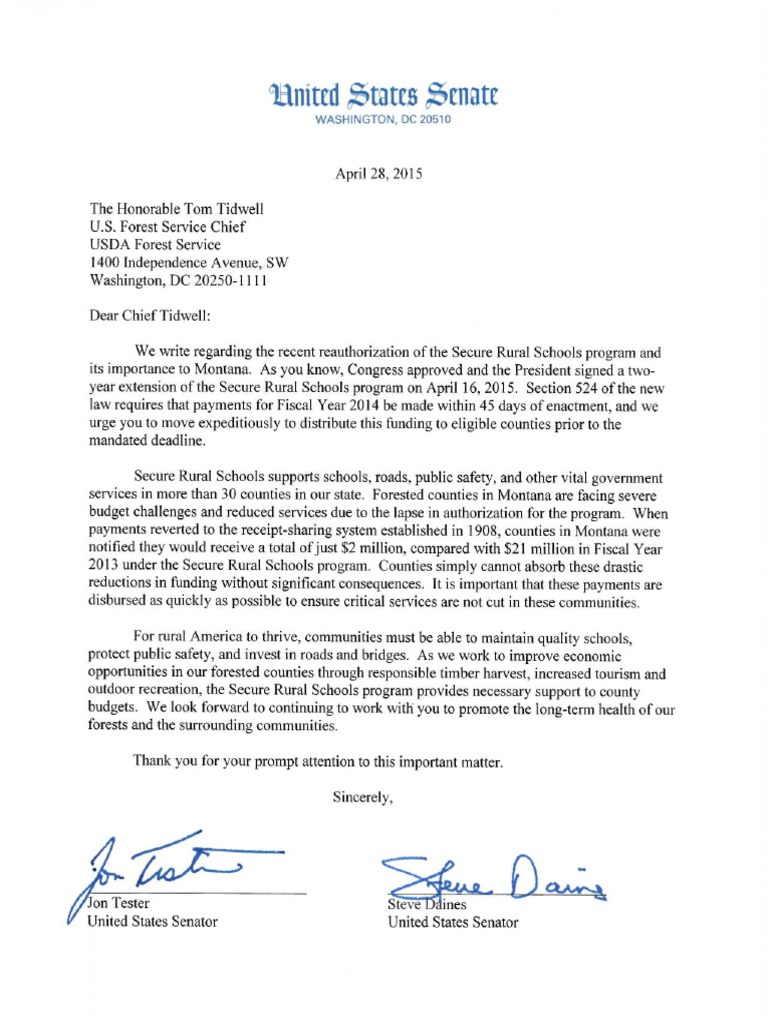 Senators Tester and Daines sent a letter to the Forest Service asking them for timely SRS payments.