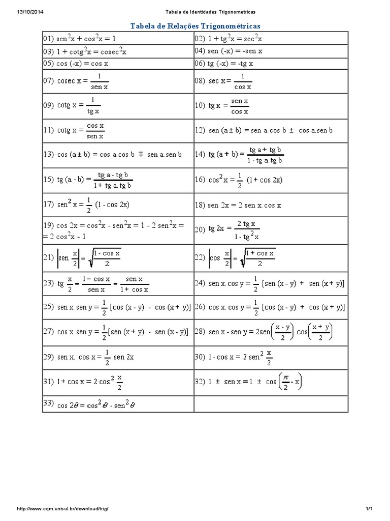 Tabela de Identidades Trigonometricas