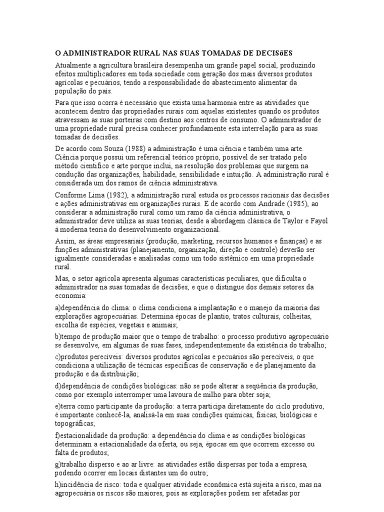 Conforme Lima (1982), a administração rural estuda os processos racionais das decisões