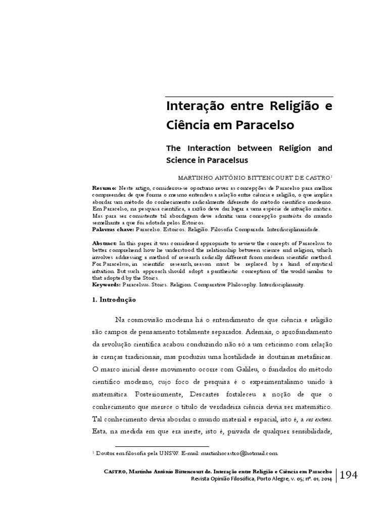 CASTRO, Martinho Antnio Bittencourt de. Interao entre Religio e Cincia em Paracelso