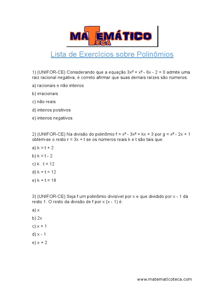 Lista de Exerccios sobre Polinmios
