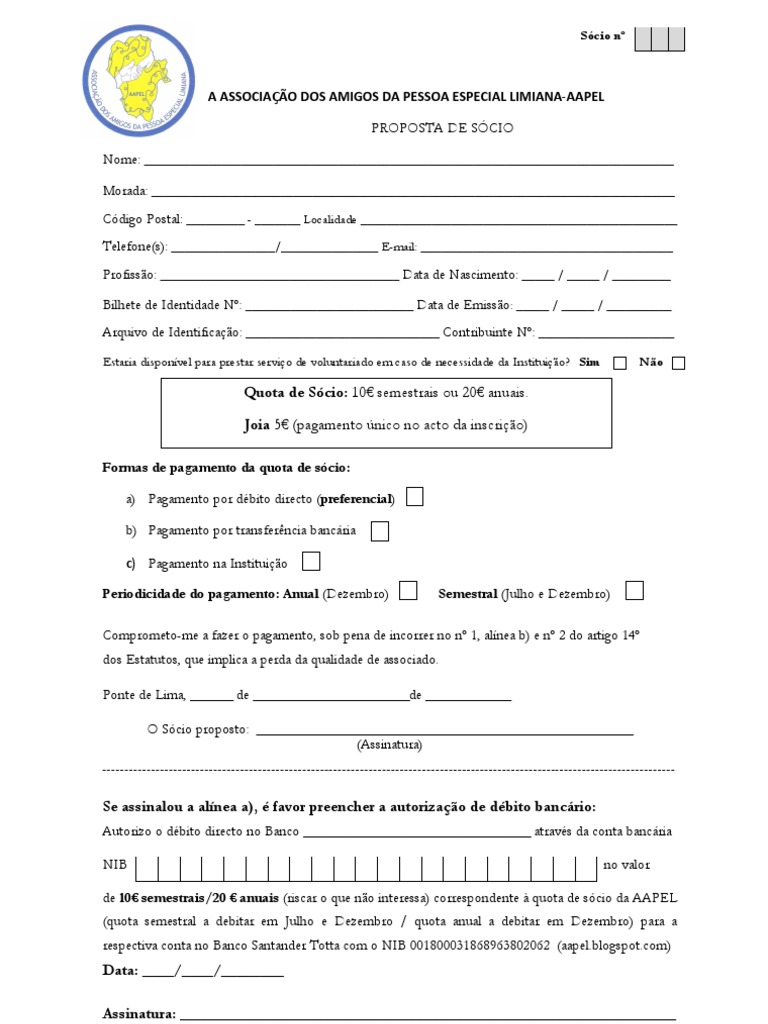 de 10€ semestrais/20 € anuais (riscar o que não interessa) correspondente à quota de sócio da AAPEL (quota semestral a debitar em Julho e Dezembro / quota anual a debitar em Dezembro) para a respectiva conta no Banco Santander Totta com o NIB 001800031868963802062 (aapel.blogspot.com)