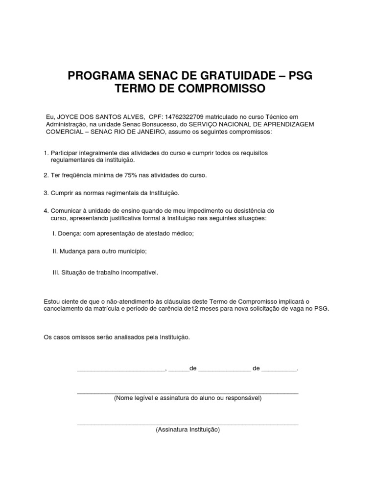 COMERCIAL – SENAC RIO DE JANEIRO, assumo os seguintes compromissos: