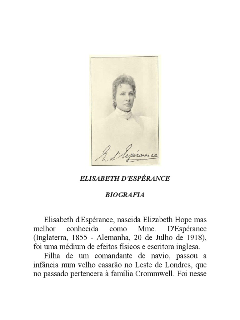 Posteriormente. passou a conviver com as visões. tornando-se patente à mediunidade de Mme. Com o domínio da psicografia. Em busca de um modo mais rápido de comunicações. o que muito a angustiou. fornecendo inclusive o nome da embarcação a bordo da qual se encontrava (o "Lizzie Morton" em Swansea). Encontrando-se a sua mãe doente.upon Tyne. necessitando submeter-se a uma cirurgia. Nesta época. o que melhor resultado produziu foi à psicografia. que começou a desenhar. D'Esperance começou a perceber figuras luminosas no ambiente. D'Espérance. cujo conselho urgente necessitava acerca do melhor tratamento para a mãe. com a companhia do marido e de um ou outro visitante. passando nesta etapa a identificarem-se os espíritos que acompanhavam aquele grupo familiar de estudos. por intermédio de um casal amigo. Elizabeth encontrava-se há algum tempo sem notícias do pai. esta informou corretamente o paradeiro do pai. passando a inquirir os espíritos sobre assuntos . diversas pessoas procuraram assistir às sessões. Isolada na nova residência. outros fenômenos se registraram. destacou-se um intelectual de nome T. Consultada a mesa. P. Tendo a notícia se espalhado na comunidade. ouviu falar no espiritismo e nas mesas girantes. que se juntou ao grupo. Entre estes. Barkas. na esperança de obterem retratos dos parentes e amigos falecidos.