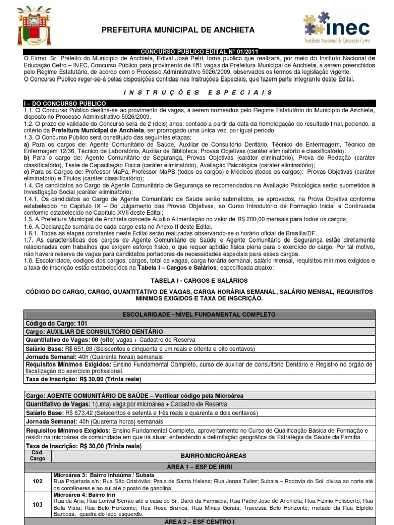 Educação Cetro – INEC, Concurso Público para provimento de 181 vagas da Prefeitura Municipal de Anchieta, a serem preenchidos