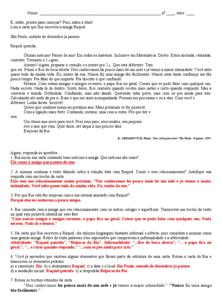5. Na carta que Bia escreveu a Raquel, ela utilizou linguagem bastante informal e afetiva, pois considera a menina como