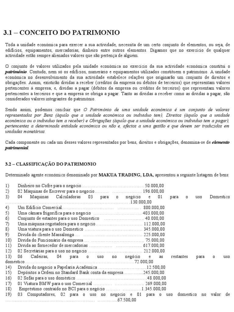 1) Classifique o Património de Makua Trading, Lda em Individual e ou