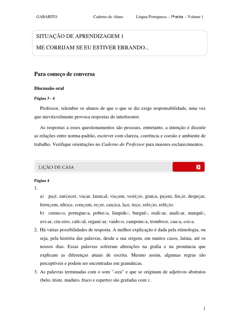 GABARITO Caderno do Aluno Língua Portuguesa – 3ª série – Volume 1
