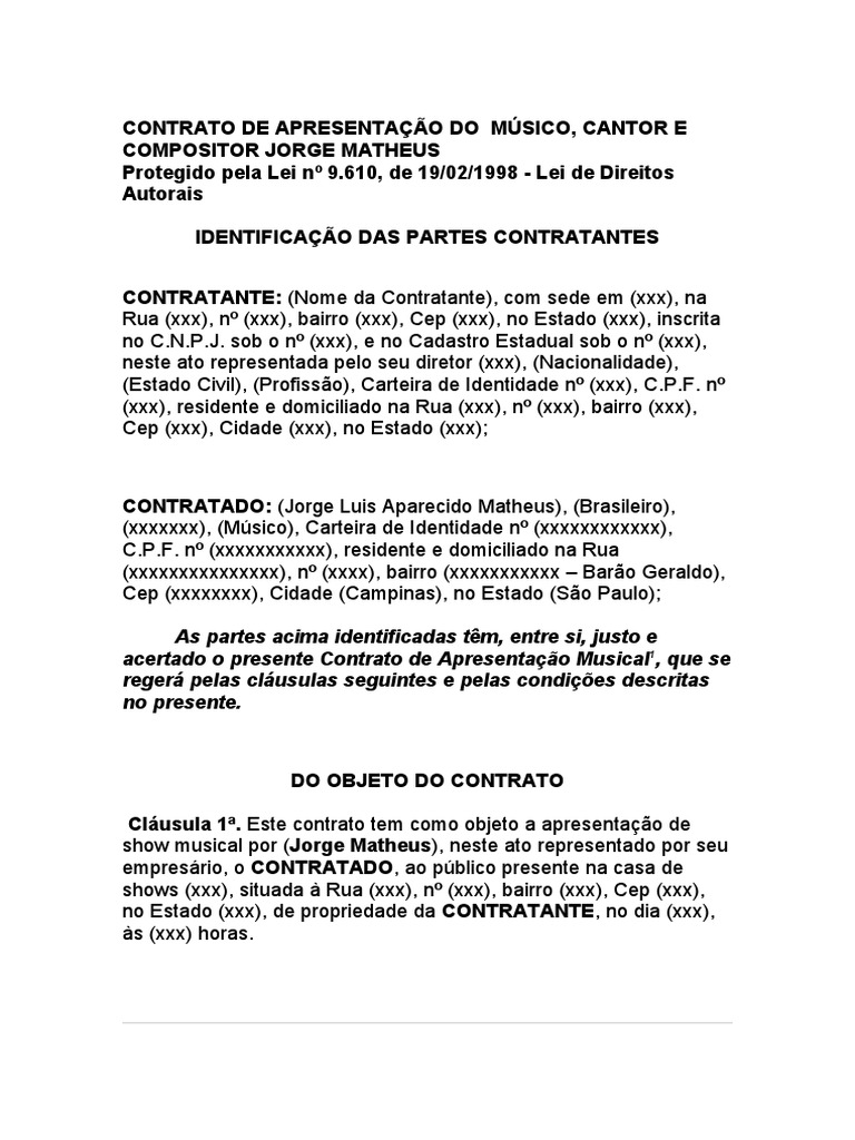 Cláusula 1ª. Este contrato tem como objeto a apresentação de