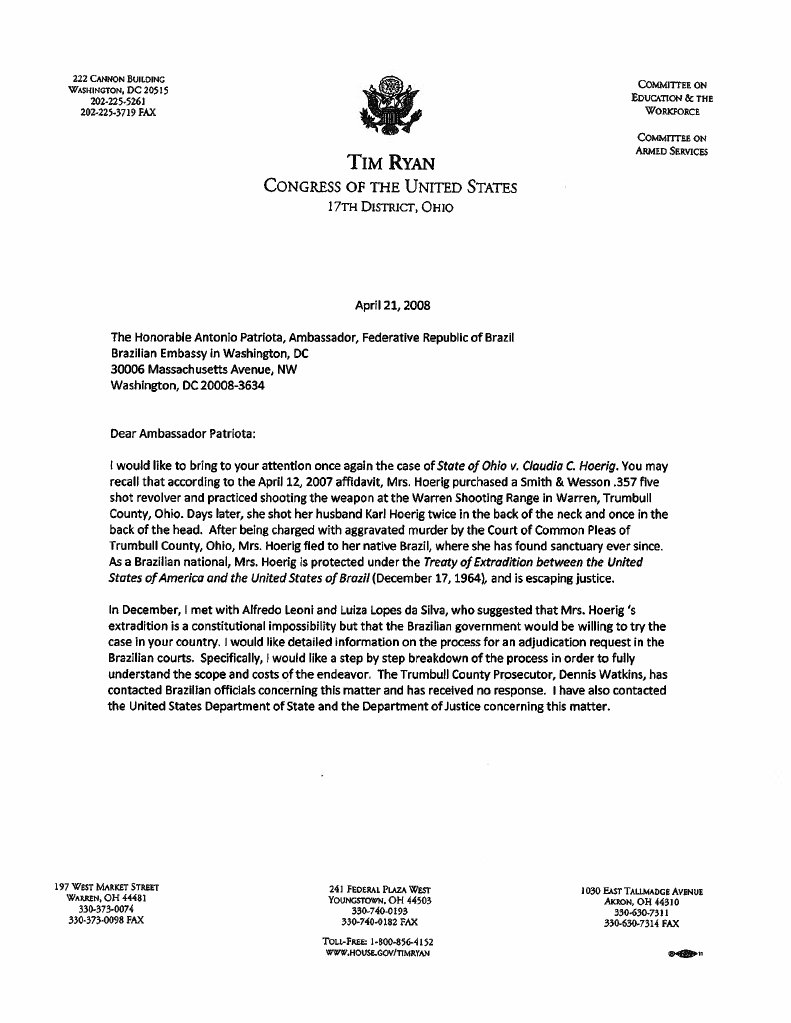 2008-04-21 Tim Ryan to Brazilian Ambassador Patriota