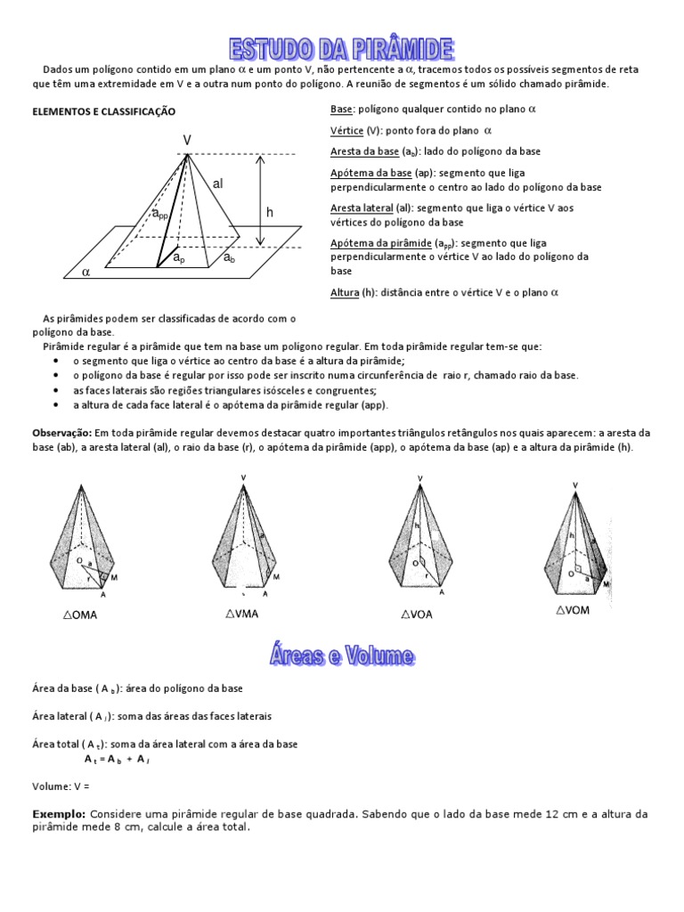 Aptema da base (ap): segmento que liga perpendicularmente o centro ao lado do polgono da base Aresta lateral (al): segmento que liga o vrtice V aos vrtices do polgono da base Aptema da pirmide (app): segmento que liga perpendicularmente o vrtice V ao lado do polgono da base Altura (h): distncia entre o vrtice V e o plano