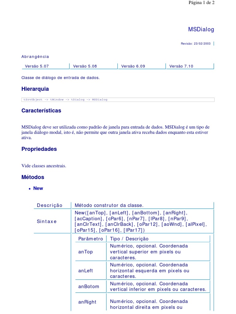 MSDialog deve ser utilizada como padro de janela para entrada de dados. MSDialog um tipo de janela dilogo modal, isto , no permite que outra janela ativa receba dados enquanto esta estiver ativa.