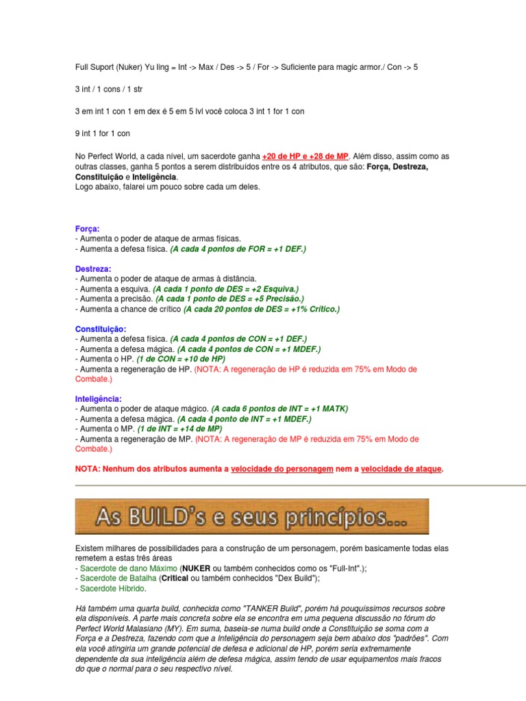 / Con -> 5 3 int / 1 cons / 1 str 3 em int 1 con 1 em dex 5 em 5 lvl voc coloca 3 int 1 for 1 con 9 int 1 for 1 con No Perfect World, a cada nvel, um sacerdote ganha +20 de HP e +28 de MP. Alm disso, assim como as outras classes, ganha 5 pontos a serem distribudos entre os 4 atributos, que so: Fora, Destreza, Constituio e Inteligncia. Logo abaixo, falarei um pouco sobre cada um deles.