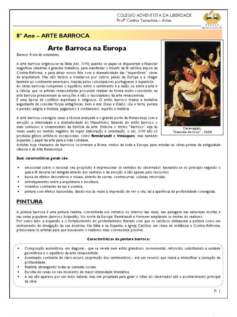 Barroco: A era do ornamento A arte barroca originou-se na Itlia (sc. XVII) quando os papas se dispuseram a financiar magnficas catedrais e grandes trabalhos, para manifestar o triunfo da f catlica depois da Contra-Reforma, e para atrair novos fiis com a dramaticidade das imperdveis obras de arquitetura. Mas no tardou a irradiar-se por outros pases da Europa e a chegar tambm ao continente americano, trazida pelos colonizadores portugueses e espanhis. As obras barrocas romperam o equilbrio entre o sentimento e a razo ou entre a arte e a cincia, que os artistas renascentistas procuram realizar de forma muito consciente; na arte barroca predominam as emoes e no o racionalismo da arte renascentista. uma poca de conflitos espirituais e religiosos. O estilo barroco traduz a tentativa angustiante de conciliar foras antagnicas: bem e mal; Deus e Diabo; cu e terra; pureza e pecado; alegria e tristeza; paganismo e cristianismo; esprito e matria. A arte barroca conseguiu casar a tcnica avanada e o grande porte da Renascena com a emoo, a intensidade e a dramaticidade do Maneirismo, fazendo do estilo barroco o mais suntuoso e ornamentado da histria da arte. Embora o termo barroco seja s Caravaggio, vezes usado no sentido negativo de super elaborao e ostentao, o sc. XVII no s "Descida da Cruz , 1608 produziu gnios artsticos excepcionais, como Rembrandt e Velsquez, mas tambm expandiu o papel da arte para a vida cotidiana. Artistas hoje chamados de barrocos ocorreram a Roma, vindos de toda a Europa, para estudar as obras-primas da antiguidade clssica e da Alta Renascena. Suas caractersticas gerais so: emocional sobre o racional; seu propsito impressionar os sentidos do observador, baseando-se no princpio segundo o qual a f deveria ser atingida atravs dos sentidos e da emoo e no apenas pelo raciocnio. busca de efeitos decorativos e visuais, atravs de curvas, contracurvas, colunas retorcidas; entrelaamento entre a arquitetura e escultura; violentos contrastes de luz e sombra; pintura com efeitos ilusionistas, dando-nos s vezes a impresso de ver o cu, tal a aparncia de profundidade conseguida.
