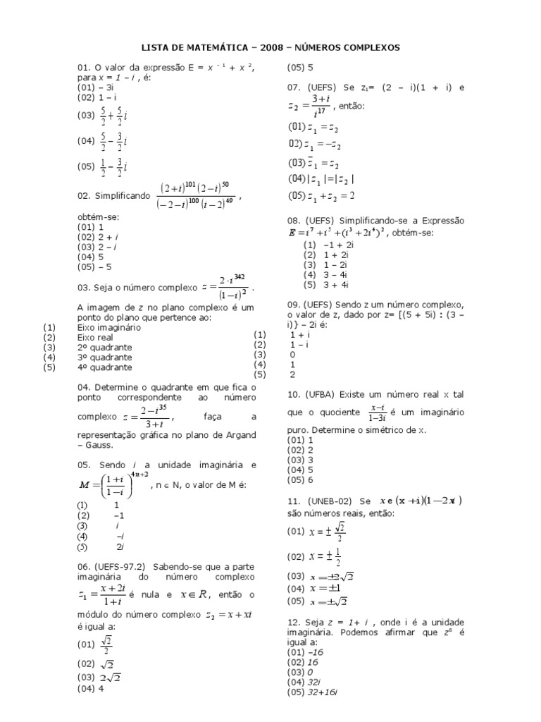 LISTA DE MATEMTICA 2008 NMEROS COMPLEXOS