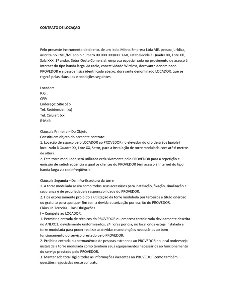 Pelo presente instrumento de direito, de um lado, Minha Empresa Ltda-ME, pessoa jurdica, inscrita no CNPJ/MF sob o nmero 00.000.000/0001-60, estabelecida Quadra XX, Lote XX, Sala XXX, 1 andar, Setor Oeste Comercial, empresa especializada no provimento de acesso Internet do tipo banda larga via radio, conectividade Wireless, doravante denominado PROVEDOR e a pessoa fsica identificada abaixo, doravante denominado LOCADOR, que se reger pelas clusulas e condies seguintes: Locador: R.G.: CPF: Endereo: Stio So Tel. Residencial: (xx) Tel. Celular: (xx) E-Mail: Clusula Primeira Do Objeto Constituem objeto do presente contrato: 1. Locao de espao pelo LOCADOR ao PROVEDOR no elevador do cilo de gros (gaiola) localizado Quadra XX, Lote XX, Setor, para a instalao de torre modulada com at 6 metros de altura. 2. Esta torre modulada ser utilizada exclusivamente pelo PROVEDOR para a repetio e emisso de radiofreqncia o qual os clientes do PROVEDOR tm acesso Internet do tipo banda larga via radiofreqncia. Clusula Segunda Da Infra-Estrutura da torre 1. A torre modulada assim como todos seus acessrios para instalao, fixao, sinalizao e segurana de propriedade e responsabilidade do PROVEDOR. 2. Fica expressamente proibido a utilizao da torre modulada por terceiros a titulo oneroso ou gratuito para qualquer fim sem a devida autorizao por escrito do PROVEDOR. Clusula Terceira Das Obrigaes I Compete ao LOCADOR: 1. Permitir a entrada de tcnicos do PROVEDOR ou empresa terceirizada devidamente descrita no ANEXO1, devidamente uniformizados, 24 horas por dia, no local onde esteja instalada a torre modulada para poder realizar as devidas manutenes necessrias ao bom funcionamento do servio prestado pelo PROVEDOR. 2. Proibir a entrada ou permanncia de pessoas estranhas ao PROVEDOR no local onde esteja instalada a torre modulada como tambm seus equipamentos necessrios ao funcionamento do servio prestado pelo PROVEDOR. 3. Manter sob total sigilo todas as informaes inerentes ao PROVEDOR como tambm questes negociadas neste contrato.
