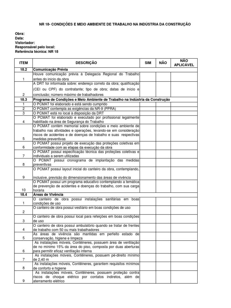 NR 18 ITEM 18.2 1 DESCRIO Comunicao Prvia Houve comunicao prvia Delegacia Regional do Trabalho antes do incio da obra A DRT foi informada sobre: endereo correto da obra; qualificao (CEI ou CPF) do contratante; tipo de obra; datas de incio e 2 18.3 1 2 3 4 concluso; nmero mximo de trabalhadores Programa de Condies e Meio Ambiente de Trabalho na Indstria da Construo O PCMAT foi elaborado e est sendo cumprido O PCMAT contempla as exigncias da NR-9 (PPRA) O PCMAT est no local disposio da DRT O PCMAT foi elaborado e executado por profissional legalmente habilitado na rea de Segurana do Trabalho O PCMAT contm memorial sobre condies e meio ambiente de trabalho nas atividades e operaes, levando-se em considerao riscos de acidentes e de doenas de trabalho e suas respectivas medidas preventivas O PCMAT possui projeto de execuo das protees coletivas em conformidade com as etapas da execuo da obra O PCMAT possui especificao tcnica das protees coletivas e individuais a serem utilizadas O PCMAT possui cronograma de implantao das medidas preventivas O PCMAT possui layout inicial do canteiro da obra, contemplando, inclusive, previso do dimensionamento das reas de vivncia O PCMAT possui um programa educativo contemplando a temtica de preveno de acidentes e doenas do trabalho, com sua carga horria reas de Vivncia O canteiro de obra possui instalaes sanitrias em boas condies de uso O canteiro de obra possui vestirio em boas condies de uso O canteiro de obra possui local para refeies em boas condies de uso O canteiro de obra possui ambulatrio quando se tratar de frentes de trabalho com 50 ou mais trabalhadores As reas de vivncia so mantidas em perfeito estado de conservao, higiene e limpeza As instalaes mveis, Contineres, possuem rea de ventilao de no mnimo 15% da rea do piso, composta por duas aberturas para permitir eficaz ventilao interna As instalaes mveis, Contineres, possuem p-direito mnimo de 2,40 m As instalaes mveis, Contineres, garantem requisitos mnimos de conforto e higiene As instalaes mveis, Contineres, possuem proteo contra riscos de choque eltrico por contatos indiretos, alm de aterramento eltrico SIM NO NO APLICVEL