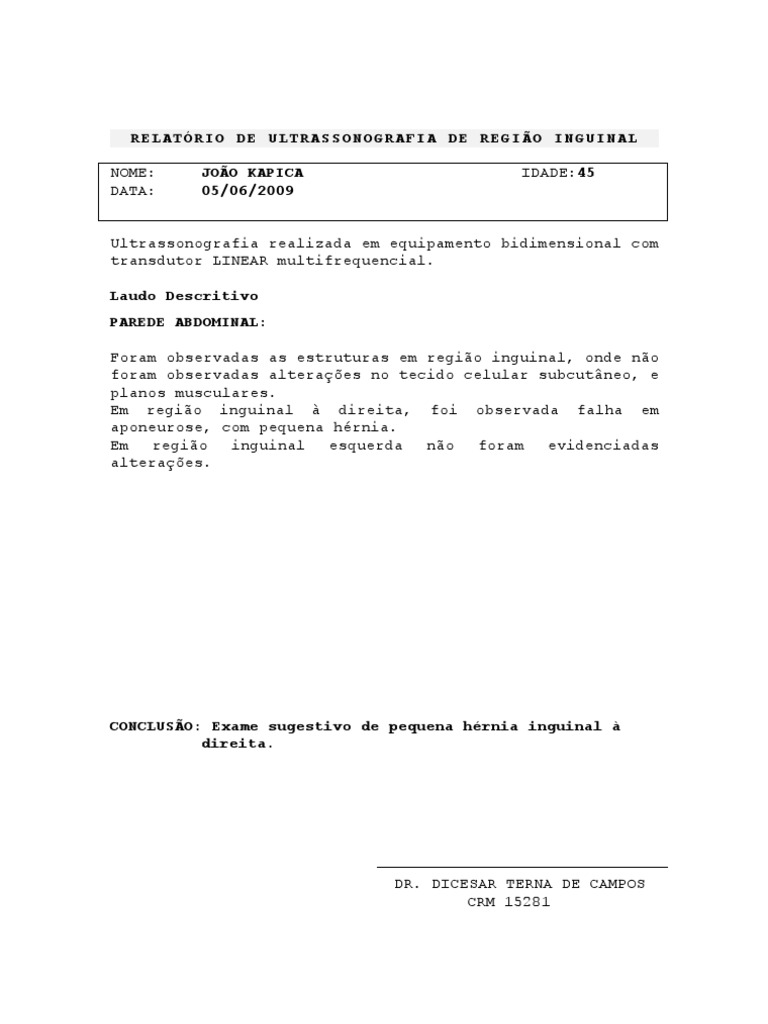 Ultrassonografia realizada em equipamento bidimensional com transdutor LINEAR multifrequencial. Laudo Descritivo PAREDE ABDOMINAL: Foram observadas as estruturas em regio inguinal, onde no foram observadas alteraes no tecido celular subcutneo, e planos musculares. Em regio inguinal direita, foi observada falha em aponeurose, com pequena hrnia. Em regio inguinal esquerda no foram evidenciadas alteraes.