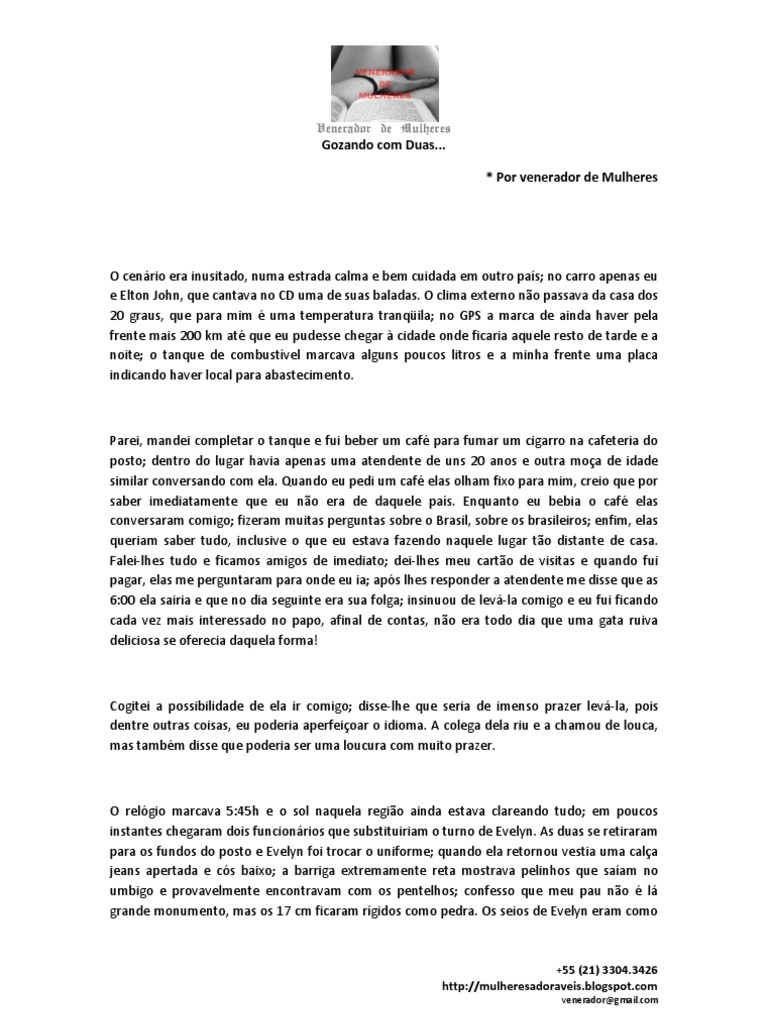 Parei, mandei completar o tanque e fui beber um caf para fumar um cigarro na cafeteria do posto; dentro do lugar havia apenas uma atendente de uns 20 anos e outra moa de idade similar conversando com ela. Quando eu pedi um caf elas olham fixo para mim, creio que por saber imediatamente que eu no era de daquele pas. Enquanto eu bebia o caf elas conversaram comigo; fizeram muitas perguntas sobre o Brasil, sobre os brasileiros; enfim, elas queriam saber tudo, inclusive o que eu estava fazendo naquele lugar to distante de casa. Falei-lhes tudo e ficamos amigos de imediato; dei-lhes meu carto de visitas e quando fui pagar, elas me perguntaram para onde eu ia; aps lhes responder a atendente me disse que as 6:00 ela sairia e que no dia seguinte era sua folga; insinuou de lev-la comigo e eu fui ficando cada vez mais interessado no papo, afinal de contas, no era todo dia que uma gata ruiva deliciosa se oferecia daquela forma!