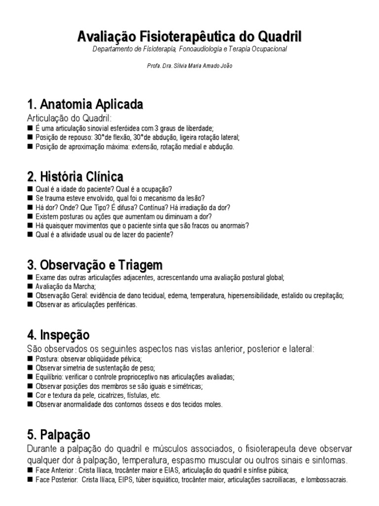 parte integrante do exame fsico, fornecendo informaes teis no diagnstico diferencial, prognstico e tratamento de patologias musculoesquelticas e neuromusculares; A avaliao da fora muscular manual deve ocorrer quando forem descartadas outras limitaes articulares ou musculares (encurtamentos) impedindo ou dificultando o movimento. Msculo Psoas Maior e Ilaco; Msculo Sartrio; Msculo Glteo Mximo; Msculos Glteo Mdio e Mnimo; Msculo Tensor da Fscia Lata; Msculos Adutores Longo, Magno e Curto, Grcil e Pectneo; Msculos Obturador Interno e Externo, Gmeo Superior e Inferior, Quadrado Femoral e Piriforme.