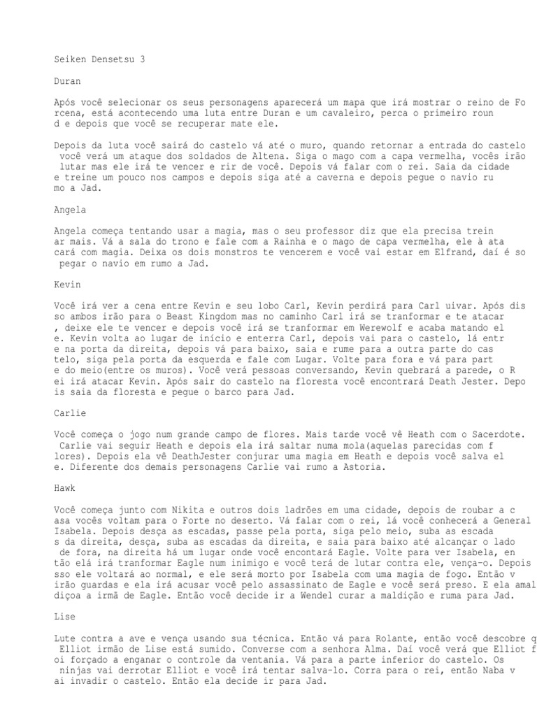 Jad/Rabite Forest Saia do navio e desa, v para o Inn e durma, e escolha para acordar a noite. Durant e a noite saia de Jad. OBS: Todos os personagens esto na cidade mas voc no consegue fazer com que eles se juntem a voc. Passe pela floresta e aproveite para treinar aqui contra os Rabbits. V at uma part e onde voc encontra um palca e siga para as cachoeiras. Voc notar uma barreira aqui . Volte e desa para Astoria. Astoria Converse com algumas pessoas, compre uns itens se desejar, e v durmir no Inn. Voc ser acordado a noite por uma bola de luz, saia do Inn e siga a bola de luz para f ora da cidade. Siga a bola pelos campos, e lute contra os inimigos no caminho. Na metade do cam inho voc encontrar uma Mana Goddess que restora seu HP/MP e depois salve seu jogo. E siga a bola at o lago. Ela ir se revelar uma fada. Volte para Astoria e voc ver q ue a cidade foi destruda pelos Beastman. Saia da cidade e volte para as cachoeiras no local onde voc foi bloqueado, aqui v oc encontrar o segundo personagem que voc escolheu. E a fada ir desbloquear a cavern a e siga para dentro dela. Cave of Waterfalls/Wendel Holy City Esse um bom lugar para treinar, j que tem uma Goddess para voc se recuperar. Desa, e continue descendo, depois pela esquerda, para cima e esquerda. Na metade voc ve r uma menina(Carlie) salve ela e observe. E depois continue seu caminho para Wend el. Em Wendel compre equipamentos novos, e itens. V para o norte e fale com o Sacerdo te. Depois retorne para as cavernas. Cave of Waterfalls Volte por aqui, treine mais um pouco se desejar e se restaure na Goddess. H um lo cal embaixo da estatua da Goddess, siga por ali, depois pela esquerda. Selecione a fada e voc poder atravessar. Lute por aqui, mais duas cenas acima e v para esque rda. Pegue a direita e continue, continue lutando e encontre o Chefe. Full Metal Hagger Acerte os olhos, e use seus Skills e se precisar use as balas para recuperar ene rgia. E ele morre facilmente. Ento voc encontrar Wisp(o esprito da luz). Treine depois para aumentar a sua intelign cia e assim aprender as magias dele(s valido se voc estiver com a Angela ou a Carl ie). Um caminho se abrir, siga por ele. E voc ser encurlado pelos inimigos e acorda r preso em Jad. Jad Fortress/Maiya Pare prximo a parede e fale com a pessoa do outro lado dela(seu prximo companheiro ). Voc ir enganar o guarda e depois escapar. Fale com a Goddes e suba as escadas. Se voc quiser eleve o nvel de seu grupo aqui, j que o novo aliado est no level 4 e v oc provavelmente no 10. Treine e v embora, v para o cais de onde voc veio de navio e pegue o navio que vai para Maiya.