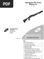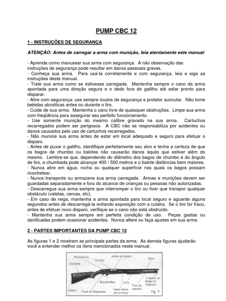1 - INSTRUES DE SEGURANA ATENO: Antes de carregar a arma com munio, leia atentamente este manual - Aprenda como manusear sua arma com segurana. A no observao das instrues de segurana pode resultar em danos pessoais graves. - Conhea sua arma. Para us-la corretamente e com segurana, leia e siga as instrues deste manual. - Trate sua arma como se estivesse carregada. Mantenha sempre o cano da arma apontada para uma direo segura e o dedo fora do gatilho at estar pronto para disparar. - Atire com segurana: use sempre culos de segurana e protetor auricular. No tome bebidas alcolicas antes ou durante o tiro. - Cuide de sua arma. Mantenha o cano livre de quaisquer obstrues. Limpe sua arma com freqncia para assegurar seu perfeito funcionamento. - Use somente munio do mesmo calibre gravado na sua arma. Cartuchos recarregados podem ser perigosos. A CBC no se responsabiliza por acidentes ou danos causados pelo uso de cartuchos recarregados. - No municie sua arma antes de estar em local adequado e seguro para efetuar o disparo. - Antes de puxar o gatilho, identifique perfeitamente seu alvo e tenha a certeza de que os bagos de chumbo ou balotes no causaro danos quilo que estiver alm do mesmo. Lembre-se que, dependendo do dimetro dos bagos de chumbo e do ngulo de tiro, a chumbada pode alcanar 400 / 500 metros e o balote distncias bem maiores. - Nunca atire em gua, rocha ou qualquer superfcie nas quais os bagos possam ricochetear. - Nunca transporte ou armazene sua arma carregada. Armas e munies devem ser guardadas separadamente e fora do alcance de crianas ou pessoas no autorizadas. - Descarregue sua arma sempre que interromper o tiro ou tiver que transpor qualquer obstculo (valetas, cercas, etc). - Em caso de nega, mantenha a arma apontada para local seguro e aguarde alguns segundos antes de descarreg-la evitando exposio com a culatra. Se o tiro for fraco, antes de efetuar novo disparo, verifique se o cano no est obstrudo. - Mantenha sua arma sempre em perfeita condio de uso. Peas gastas ou danificadas podem ocasionar acidentes. Nunca altere ou faa ajustes em sua arma. 2 - PARTES IMPORTANTES DA PUMP CBC 12 As figuras 1 e 2 mostram as principais partes da arma. As demais figuras ajudaro voc a entender melhor os itens mencionados neste manual.