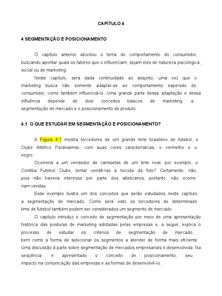 sejam eles de natureza psicolgica, social ou de marketing. Neste captulo, ser dada continuidade ao assunto, uma vez que o marketing influncia busca no somente de dois adaptar-se conceitos ao comportamento de esperado do a consumidor, como tambm influenci-Io. Uma grande parte dessa adaptao e dessa depende bsicos marketing: segmentao de mercado e o posicionamento de produto. 4.1 O QUE ESTUDAR EM SEGMENTAO E POSICIONAMENTO? A Figura 4.1 mostra torcedores de um grande time brasileiro de futebol, o Clube Atltico Paranaense, com suas cores caractersticas, o vermelho e o negro. Ocorreria a um vendedor de camisetas de um time rival, por exemplo, o Coritiba Futebol Clube, tentar vend-Ias torcida da foto? Certamente, no, pois no haveria interesse por parte dos atleticanos, portanto, no ocorreriam vendas. Esse exemplo ilustra um dos conceitos que sero estudados neste captulo, a segmentao de mercado. Como ser visto os torcedores de determinado time de futebol tambm podem ser considerados um segmento de mercado. O captulo introduz o conceito de segmentao por meio de uma apresentao histrica das posturas de marketing adotadas pelas empresas e, a seguir, explica o processo de estudar os critrios de segmentao de mercado, bem como a forma de selecionar os segmentos a atender de forma mais eficiente. Uma discusso parte sobre segmentao de mercados empresariais desenvolvida. Na seqncia, apresentado o conceito de posicionamento, seu impacto na comunicao das empresas e as formas de desenvolv-Io.