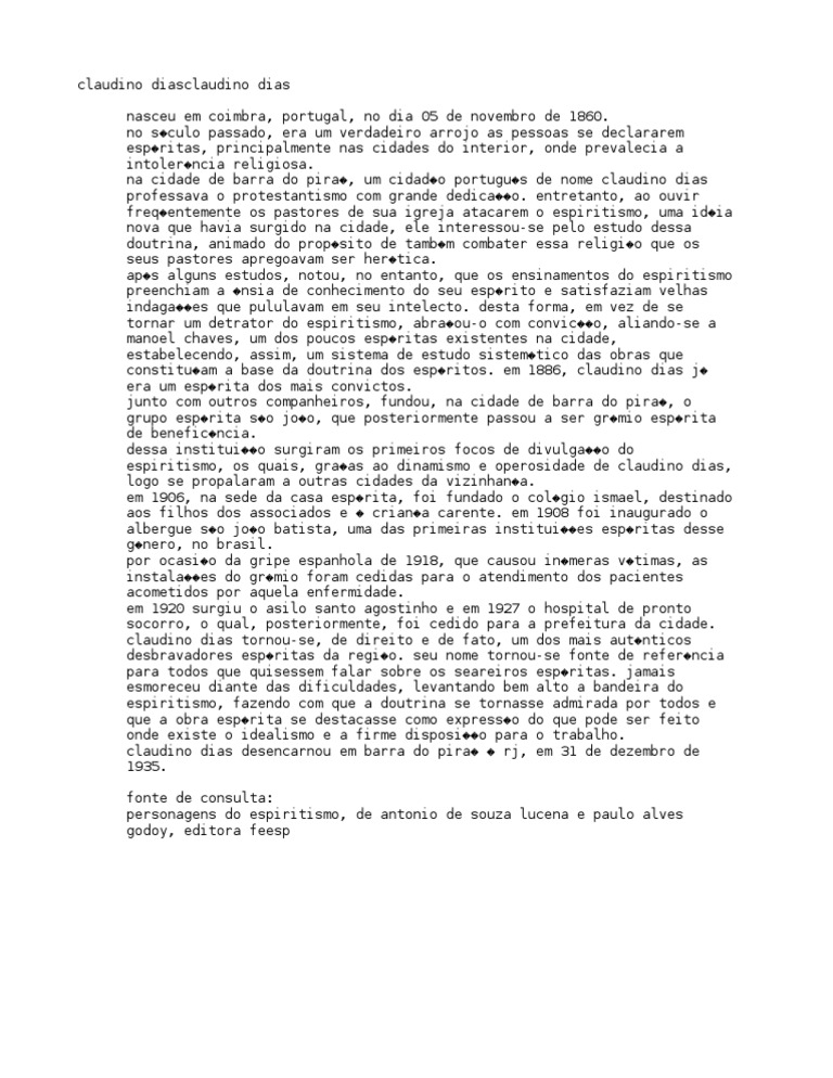 no s�culo passado, era um verdadeiro arrojo as pessoas se declararem esp�ritas, principalmente nas cidades do interior, onde prevalecia a intoler�ncia religiosa. na cidade de barra do pira�, um cidad�o portugu�s de nome claudino dias professava o protestantismo com grande dedica��o. entretanto, ao ouvir freq�entemente os pastores de sua igreja atacarem o espiritismo, uma id�ia nova que havia surgido na cidade, ele interessou-se pelo estudo dessa doutrina, animado do prop�sito de tamb�m combater essa religi�o que os seus pastores apregoavam ser her�tica. ap�s alguns estudos, notou, no entanto, que os ensinamentos do espiritismo preenchiam a �nsia de conhecimento do seu esp�rito e satisfaziam velhas indaga��es que pululavam em seu intelecto. desta forma, em vez de se tornar um detrator do espiritismo, abra�ou-o com convic��o, aliando-se a manoel chaves, um dos poucos esp�ritas existentes na cidade, estabelecendo, assim, um sistema de estudo sistem�tico das obras que constitu�am a base da doutrina dos esp�ritos. em 1886, claudino dias j� era um esp�rita dos mais convictos. junto com outros companheiros, fundou, na cidade de barra do pira�, o grupo esp�rita s�o jo�o, que posteriormente passou a ser gr�mio esp�rita de benefic�ncia. dessa institui��o surgiram os primeiros focos de divulga��o do espiritismo, os quais, gra�as ao dinamismo e operosidade de claudino dias, logo se propalaram a outras cidades da vizinhan�a. em 1906, na sede da casa esp�rita, foi fundado o col�gio ismael, destinado aos filhos dos associados e � crian�a carente. em 1908 foi inaugurado o albergue s�o jo�o batista, uma das primeiras institui��es esp�ritas desse g�nero, no brasil. por ocasi�o da gripe espanhola de 1918, que causou in�meras v�timas, as instala��es do gr�mio foram cedidas para o atendimento dos pacientes acometidos por aquela enfermidade. em 1920 surgiu o asilo santo agostinho e em 1927 o hospital de pronto socorro, o qual, posteriormente, foi cedido para a prefeitura da cidade. claudino dias tornou-se, de direito e de fato, um dos mais aut�nticos desbravadores esp�ritas da regi�o. seu nome tornou-se fonte de refer�ncia para todos que quisessem falar sobre os seareiros esp�ritas. jamais esmoreceu diante das dificuldades, levantando bem alto a bandeira do espiritismo, fazendo com que a doutrina se tornasse admirada por todos e que a obra esp�rita se destacasse como express�o do que pode ser feito onde existe o idealismo e a firme disposi��o para o trabalho. claudino dias desencarnou em barra do pira� � rj, em 31 de dezembro de 1935.