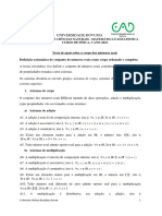(Referncia: Calculus, Vol 1. Tom Apostol) R um corpo (Axiomas de Corpo) Adio: x+ y soma de x e y Multiplicao : xy o produto de x e y Axiomas de Corpo: I) II) III) IV) V) Associativa: ( a+b)+c = a + (b+c) e (ab)c=a(bc) Comutativa: a+b = b+a e ab = BA Elemento neutro: 0 R tal que x+ 0 = x. 1 R tal que x.1=x Inverso: a R, (-a) tal que a + (-a) = 0. a R, a0, a-1 tal que a.a-1=1 Distributiva: a(b+c) = ab + AC