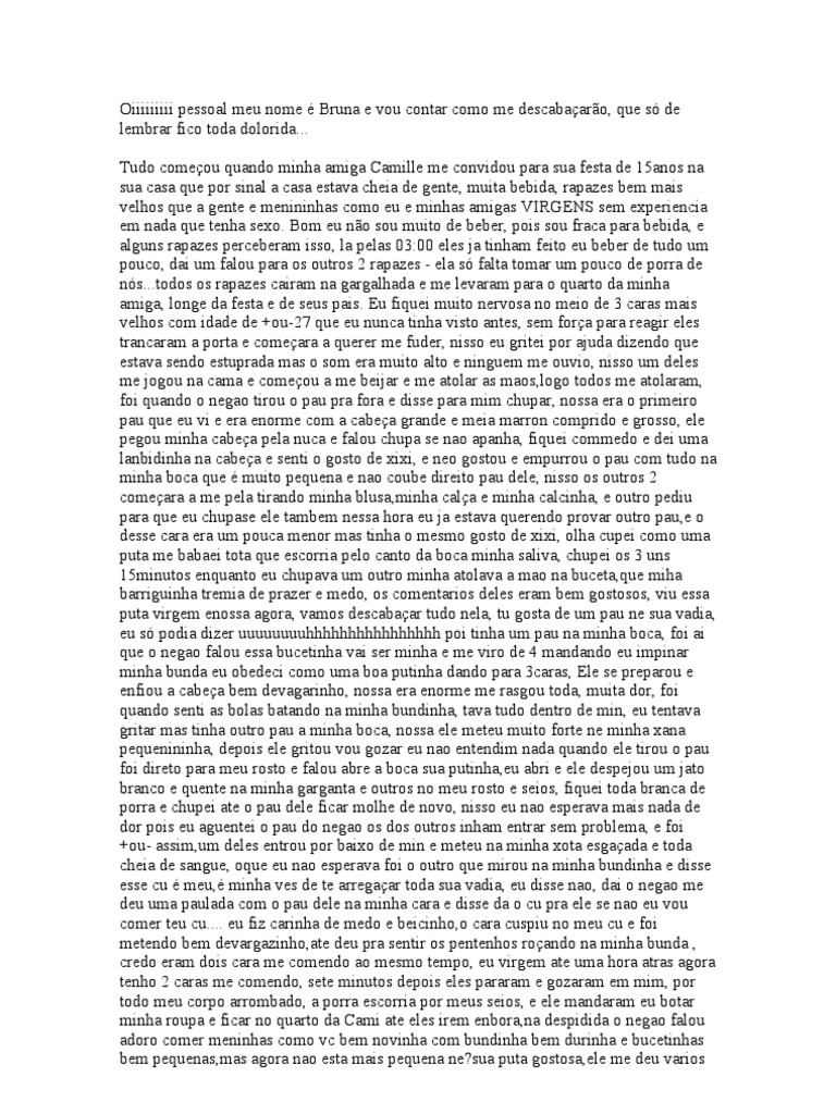 . Tudo comeou quando minha amiga Camille me convidou para sua festa de 15anos na sua casa que por sinal a casa estava cheia de gente, muita bebida, rapazes bem mais velhos que a gente e menininhas como eu e minhas amigas VIRGENS sem experiencia em nada que tenha sexo. Bom eu no sou muito de beber, pois sou fraca para bebida, e alguns rapazes perceberam isso, la pelas 03:00 eles ja tinham feito eu beber de tudo um pouco, dai um falou para os outros 2 rapazes - ela s falta tomar um pouco de porra de ns...todos os rapazes cairam na gargalhada e me levaram para o quarto da minha amiga, longe da festa e de seus pais. Eu fiquei muito nervosa no meio de 3 caras mais velhos com idade de +ou-27 que eu nunca tinha visto antes, sem fora para reagir eles trancaram a porta e comeara a querer me fuder, nisso eu gritei por ajuda dizendo que estava sendo estuprada mas o som era muito alto e ninguem me ouvio, nisso um deles me jogou na cama e comeou a me beijar e me atolar as maos,logo todos me atolaram, foi quando o negao tirou o pau pra fora e disse para mim chupar, nossa era o primeiro pau que eu vi e era enorme com a cabea grande e meia marron comprido e grosso, ele pegou minha cabea pela nuca e falou chupa se nao apanha, fiquei commedo e dei uma lanbidinha na cabea e senti o gosto de xixi, e neo gostou e empurrou o pau com tudo na minha boca que muito pequena e nao coube direito pau dele, nisso os outros 2 comeara a me pela tirando minha blusa,minha cala e minha calcinha, e outro pediu para que eu chupase ele tambem nessa hora eu ja estava querendo provar outro pau,e o desse cara era um pouca menor mas tinha o mesmo gosto de xixi, olha cupei como uma puta me babaei tota que escorria pelo canto da boca minha saliva, chupei os 3 uns 15minutos enquanto eu chupava um outro minha atolava a mao na buceta,que miha barriguinha tremia de prazer e medo, os comentarios deles eram bem gostosos, viu essa puta virgem enossa agora, vamos descabaar tudo nela, tu gosta de um pau ne sua vadia, eu s podia dizer uuuuuuuuhhhhhhhhhhhhhhhh poi tinha um pau na minha boca, foi ai que o negao falou essa bucetinha vai ser minha e me viro de 4 mandando eu impinar minha bunda eu obedeci como uma boa putinha dando para 3caras, Ele se preparou e enfiou a cabea bem devagarinho, nossa era enorme me rasgou toda, muita dor, foi quando senti as bolas batando na minha bundinha, tava tudo dentro de min, eu tentava gritar mas tinha outro pau a minha boca, nossa ele meteu muito forte ne minha xana pequenininha, depois ele gritou vou gozar eu nao entendim nada quando ele tirou o pau foi direto para meu rosto e falou abre a boca sua putinha,eu abri e ele despejou um jato branco e quente na minha garganta e outros no meu rosto e seios, fiquei toda branca de porra e chupei ate o pau dele ficar molhe de novo, nisso eu nao esperava mais nada de dor pois eu aguentei o pau do negao os dos outros inham entrar sem problema, e foi +ou- assim,um deles entrou por baixo de min e meteu na minha xota esgaada e toda cheia de sangue, oque eu nao esperava foi o outro que mirou na minha bundinha e disse esse cu meu, minha ves de te arregaar toda sua vadia, eu disse nao, dai o negao me deu uma paulada com o pau dele na minha cara e disse da o cu pra ele se nao eu vou comer teu cu.... eu fiz carinha de medo e beicinho,o cara cuspiu no meu cu e foi metendo bem devargazinho,ate deu pra sentir os pentenhos roando na minha bunda , credo eram dois cara me comendo ao mesmo tempo, eu virgem ate uma hora atras agora tenho 2 caras me comendo, sete minutos depois eles pararam e gozaram em mim, por todo meu corpo arrombado, a porra escorria por meus seios, e ele mandaram eu botar minha roupa e ficar no quarto da Cami ate eles irem enbora,na despidida o negao falou adoro comer meninhas como vc bem novinha com bundinha bem durinha e bucetinhas bem pequenas,mas agora nao esta mais pequena ne?sua puta gostosa,ele me deu varios