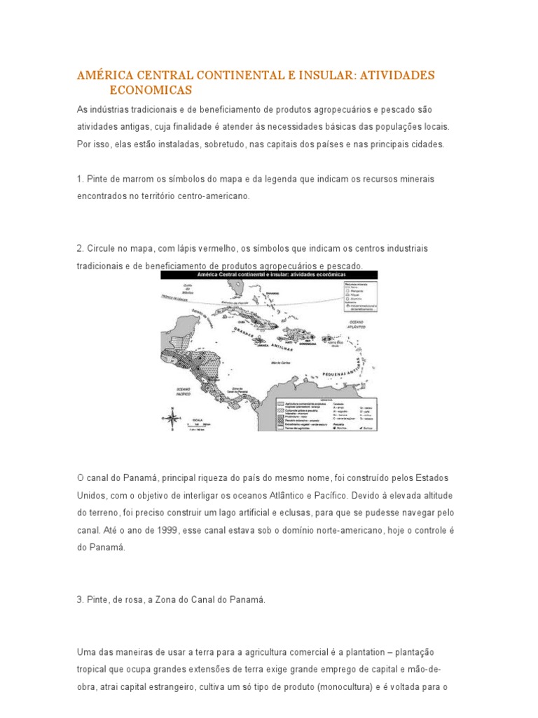 Gabarito Observe o mapa e assinale com X as afirmativas corretas. Se necessrio, busque auxilio em um atlas. 5. ( X ) Podemos afirmar que na maioria dos pases da Amrica Central pratica-se a agricultura comercial de produtos tropicais. 6. ( ) O canal do Panam est localizado na Costa Rica e serve para interligar os oceanos Atlntico e Pacfico. 7. ( ) Em Cuba, praticam-se a cultura de gros e a criao intensiva de gado. 8. ( X ) Nas ilhas das Grandes Antilhas pratica-se a agricultura comercial de produtos tropicais, principalmente de cana-de-acar, caf, banana, tabaco e algodo. 9. ( X ) Entre as frutas exportadas na Amrica Central continental, destaca-se a banana. 10. ( X ) A atividade industrial da Amrica Central bastante modesta e caracterizada pelas indstrias de refino e aproveitamento dos subprodutos de acar e pelas indstrias alimentcias. 11. ( X ) Os centros industriais da Amrica Central so tambm as capitais dos pases onde esto localizados. 12. ( X ) A Jamaica o maior produtor mundial de alumnio. 13. ( ) Na Amrica Central continental explora-se alumnio em grande quantidade.