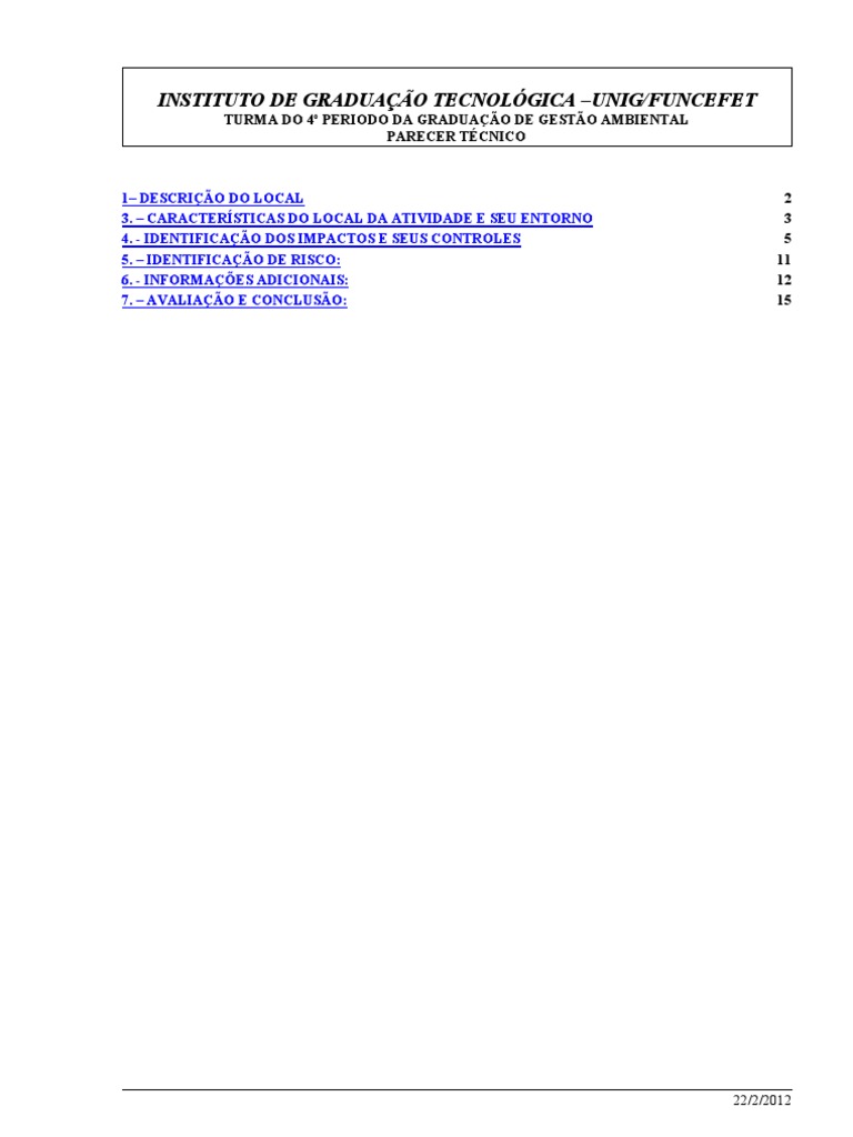 1 DESCRIO DO LOCAL 3. CARACTERSTICAS DO LOCAL DA ATIVIDADE E SEU ENTORNO 4. - IDENTIFICAO DOS IMPACTOS E SEUS CONTROLES 5. IDENTIFICAO DE RISCO: 6. - INFORMAES ADICIONAIS: 7. AVALIAO E CONCLUSO: