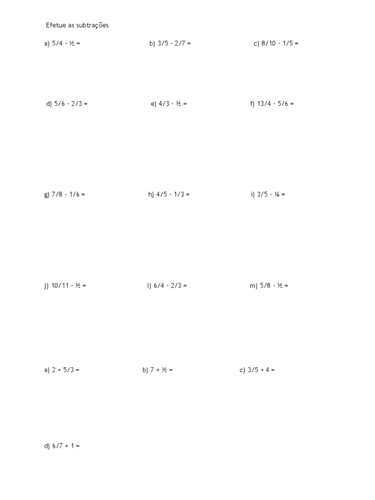 Efetue as subtraes a) 5/4 = b) 3/5 2/7 = c) 8/10 1/5 =
