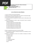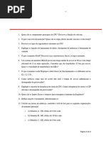 Descreva as operaes desempenhadas pela UC, ULA e os respectivos registradores envolvidos na execuo do trecho de programa armazenado entre os endereos 100 e 103. 18. Qual o objetivo do uso de interrupes? O que muda no ciclo de instrues bsico para o tratamento de uma interrupo? Descreva as atividades necessrias em um ciclo de interrupo. 19. Como a CPU pode lidar com vrias interrupes? Descreva o funcionamento bsico de cada alternativa dada. 20. Descreva com suas palavras o que um barramento. Indique e explique a funo das suas principais vias. 21. Descreva a participao dos componentes ativo e passivo em uma transao de leitura pelo barramento. O que muda para uma transao de escrita? 22. Descreva os tipos de barramentos que podem existir entre a CPU, a memria principal e o sistema de E/S. 23. Apresente e discuta sobre os aspectos relevantes em um projeto de barramento. Esta discusso deve estar embasada no desempenho e custo do barramento. 24. Descreva como feita uma operao de leitura de dados em um barramento sncrono e em um barramento assncrono. 25. Como funciona a codificao BCD? Exemplifique esta codificao para o nmero 5347. Qual a desvantagem desta abordagem em relao ao sistema binrio tradicional? 26. Qual a unidade natural de organizao da memria? Por qu? 27. Defina e categorize cada uma das seguintes caractersticas de um sistema de memria: a. Capacidade b. Unidade de transferncia c. Tipo fsico d. Persistncia e. Alterabilidade f. Localizao 28. Defina o que organizao de uma memria. 29. Explique cada um dos mtodos de acesso utilizados nos sistemas de memria. D um exemplo de memria que usa cada mtodo de acesso. 30. Quais so os parmetros utilizados no clculo de desempenho de uma memria? Explique-os. 31. O que uma memria RAM? Quais so suas caractersticas fsicas? Quais so os tipos de memria RAM existentes? Explique cada um deles, ressaltando suas diferenas. 32. Apresente e explique cada tipo de memria no-voltil, mostrando as caractersticas que as diferenciam. 33. Dado que um sistema de memria DRAM tem um tempo de acesso mdio de 60 ns e um tempo necessrio para as operaes adicionais da memria entre os acessos de 15 ns, e considerando que a cada acesso so transferidos 32 bits. Qual a velocidade de transferncia desta memria? 34. O que uma hierarquia de memria? Qual o seu objetivo e idia bsica? Apresente um diagrama de nveis hierrquicos com os principais tipos de memria presentes em um