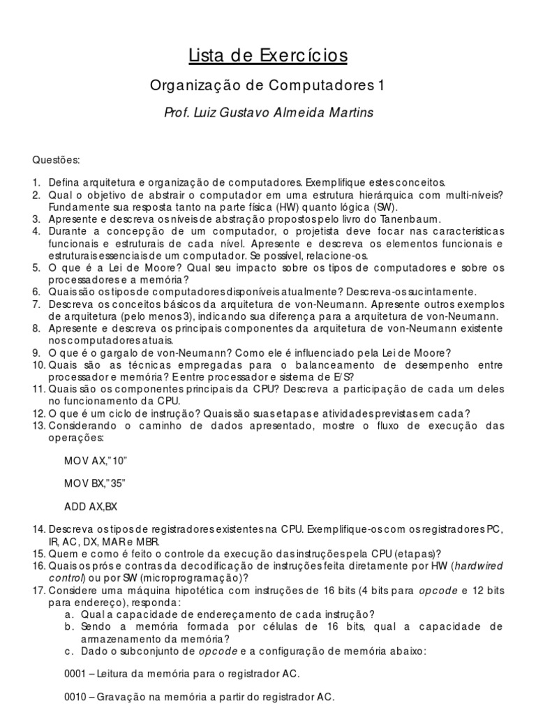 Questes: 1. Defina arquitetura e organizao de computadores. Exemplifique estes conceitos. 2. Qual o objetivo de abstrair o computador em uma estrutura hierrquica com multi-nveis? Fundamente sua resposta tanto na parte fsica (HW) quanto lgica (SW). 3. Apresente e descreva os nveis de abstrao propostos pelo livro do Tanenbaum. 4. Durante a concepo de um computador, o projetista deve focar nas caractersticas funcionais e estruturais de cada nvel. Apresente e descreva os elementos funcionais e estruturais essenciais de um computador. Se possvel, relacione-os. 5. O que a Lei de Moore? Qual seu impacto sobre os tipos de computadores e sobre os processadores e a memria? 6. Quais so os tipos de computadores disponveis atualmente? Descreva-os sucintamente. 7. Descreva os conceitos bsicos da arquitetura de von-Neumann. Apresente outros exemplos de arquitetura (pelo menos 3), indicando sua diferena para a arquitetura de von-Neumann. 8. Apresente e descreva os principais componentes da arquitetura de von-Neumann existente nos computadores atuais. 9. O que o gargalo de von-Neumann? Como ele influenciado pela Lei de Moore? 10. Quais so as tcnicas empregadas para o balanceamento de desempenho entre processador e memria? E entre processador e sistema de E/S? 11. Quais so os componentes principais da CPU? Descreva a participao de cada um deles no funcionamento da CPU. 12. O que um ciclo de instruo? Quais so suas etapas e atividades previstas em cada? 13. Considerando o caminho de dados apresentado, mostre o fluxo de execuo das operaes: MOV AX,10 MOV BX,35 ADD AX,BX 14. Descreva os tipos de registradores existentes na CPU. Exemplifique-os com os registradores PC, IR, AC, DX, MAR e MBR. 15. Quem e como feito o controle da execuo das instrues pela CPU (etapas)? 16. Quais os prs e contras da decodificao de instrues feita diretamente por HW (hardwired control) ou por SW (microprogramao)? 17. Considere uma mquina hipottica com instrues de 16 bits (4 bits para opcode e 12 bits para endereo), responda: a. Qual a capacidade de endereamento de cada instruo? b. Sendo a memria formada por clulas de 16 bits, qual a capacidade de armazenamento da memria? c. Dado o subconjunto de opcode e a configurao de memria abaixo: 0001 Leitura da memria para o registrador AC. 0010 Gravao na memria a partir do registrador AC.