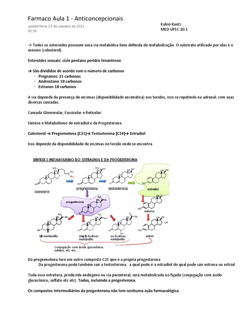 Progesterona antecedida pelo colesterol - Pregnenolona Origem testosterona Estradiol Progesterona tambm tem receptor nuclear, como o estrognio Aes da plula combinada - Inibio da ovulao (inibe o LH) - Alteraes endometriais (atrofia de endomtrio e diminuio da secreo das glndulas endometriais, ou seja, o ambiente no receptivo caso tenha ocorrido fertilizao) - Alteraes do muco cervical (se torna mais espesso e viscoso - devido progesterona?isso causa uma barreira passagem do espermatozoide) Mecanismo de Ao (E2) - Inibio da ovulao (Inibe LH) - Inibio do FSH, inibindo a "formao" (na verdade a seleo) do folculo dominante - Potencializa a ao das progestinas, mas no de forma suficiente como a endgena - Mantm o padro de sangramento cclico Quando a mulher pra de tomar, o sangramento igual ao do ciclo menstrual O principal estrognio dos contraceptivos hormonais o etinil-estradiol - O desenvolvimento do estradiol (17--estradiol) para uso teraputico muito recente - na sua forma micronizada. Ou seja, todos os mtodos atuais usam o etinil-estradiol.