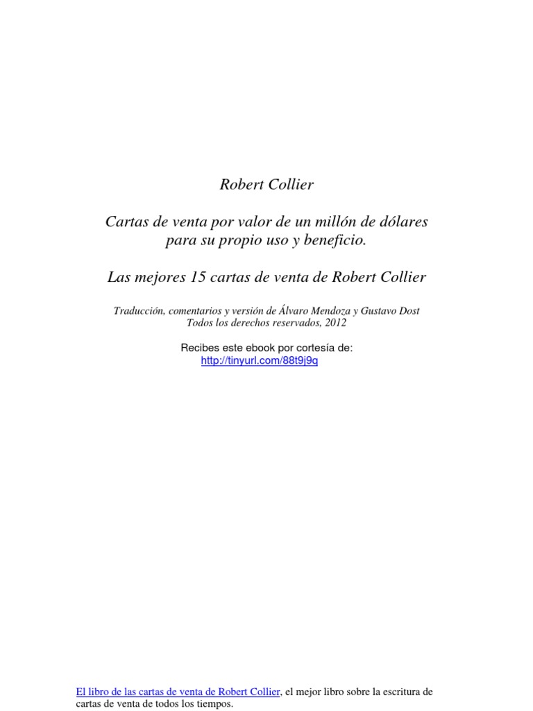 El correo puede ser el mtodo ms sencillo y barato de poder vender sus servicios o mercancas. Pero tambin puede llegar a ser la forma ms difcil y cara de conseguirlo. Todo depende del mtodo que utilice a la hora de presentar su oferta a sus posibles clientes; es decir, depende del tipo de carta que les enve. Para escribir una carta con xito, un mensaje que explique de manera resumida y completa lo que ofrece, al mismo tiempo que incita al posible cliente a actuar como usted quiere que lo haga es un trabajo que demanda los servicios de un experto conocedor de cada una de las miles de frases para vender existentes y uno con muchos aos de exitosa experiencia en la venta por correo a sus espaldas. Si tuviera que elegir a un solo hombre de todos los Estados Unidos que pudiera escribirle una carta de ventas que producira los resultados que usted desea, probablemente pedira a Robert Collier que aceptara el trabajo. Respaldado por muchos aos de xitos ininterrumpidos en el campo de la venta por correo, habiendo vendido todo tipo de mercancas, desde maquinaria para excavar zanjas hasta fertilizantes, libros y chubasqueros, stocks, bonos y servicios, ha puesto ciento de millones de dlares en los bolsillos de los clientes para los que ha escrito sus hbiles cartas de venta. Como consecuencia, l es en la actualidad el escritor de cartas de venta ms importante de Amrica. Hemos pedido al seor Collier que seleccione para nosotros, de entre las miles de cartas que ha escrito, las que considere las mejores. Fue un trabajo difcil el elegir solo quince de las diez mil que ha escrito, pero ha acabado el trabajo y aqu le presentamos estas cartas. Estas son las quince cartas consideradas como las mejores que jams escribi el hombre que se considera hoy en da como el mejor escritor de cartas de venta de toda Amrica. Han sido comprobadas, utilizadas y han vendido de verdad servicios y mercancas por valor de ms de un milln de dlares. Estas cartas tambin vendern para usted. Elija aquellas que se puedan aplicar ms fcilmente a su negocio. Cmbielas tan solo lo justo para que se El libro de las cartas de venta de Robert Collier, el mejor libro sobre la escritura de cartas de venta de todos los tiempos.
