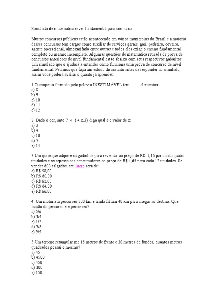 desses concursos tem cargos como auxiliar de servios gerais, gari, pedreiro, coveiro, agente operacional, almoxarifado entre outros e todos eles exige o ensino fundamental completo ou mesmo incompleto. Algumas questes de matemtica retirada de prova de concursos anteriores de nvel fundamental esto abaixo com seus respectivos gabaritos. Um simulado que o ajudar a entender como funciona uma prova de concurso de nvel fundamental. Pedimos que faa um estudo do assunto antes de responder ao simulado, assim voc poder avaliar o quanto j aprendeu. 1.O conjunto formado pela palavra INESTIMVEL tem ____ elementos: a) 8 b) 9 c) 10 d) 11 e) 12 2. Dado o conjunto 7 { 4,x,3} diga qual o valor de x: a) 3 b) 4 c) 10 d) 7 e) 14 [Link] quiosque adquire salgadinhos para revenda, ao preo de R$: 1,16 para cada quatro unidades e os repassa aos consumidores ao preo de R$ 4,65 para cada 12 unidades. Se vender 600 salgados, seu lucro ser de: a) R$ 58,00 b) R$ 60,00 c) R$ 62,00 d) R$ 64,00 e) R$ 66,00 4. Um motorista percorreu 200 km e ainda faltam 40 km para chegar ao destino. Que frao do percurso ele percorreu? a) 5/6 b) 3/4 c) 1/2 d) 7/8 e) 9/5 [Link] terreno retangular me 15 metros de frente e 30 metros de fundos, quantos metros quadrados possui o mesmo? a) 45 b) 4500 c) 450 d) 300 e) 150