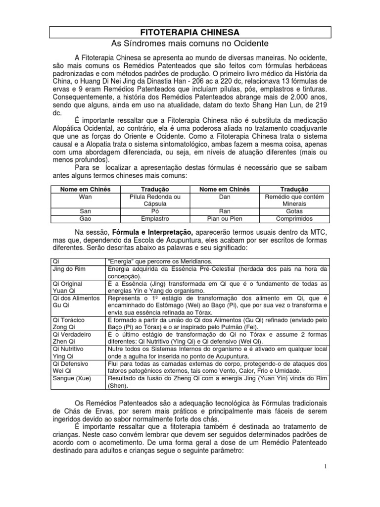 A Fitoterapia Chinesa se apresenta ao mundo de diversas maneiras. No ocidente, so mais comuns os Remdios Patenteados que so feitos com frmulas herbceas padronizadas e com mtodos padres de produo. O primeiro livro mdico da Histria da China, o Huang Di Nei Jing da Dinastia Han - 206 ac a 220 dc, relacionava 13 frmulas de ervas e 9 eram Remdios Patenteados que incluam plulas, ps, emplastros e tinturas. Consequentemente, a histria dos Remdios Patenteados abrange mais de 2.000 anos, sendo que alguns, ainda em uso na atualidade, datam do texto Shang Han Lun, de 219 dc. importante ressaltar que a Fitoterapia Chinesa no substituta da medicao Aloptica Ocidental, ao contrrio, ela uma poderosa aliada no tratamento coadjuvante que une as foras do Oriente e Ocidente. Como a Fitoterapia Chinesa trata o sistema causal e a Alopatia trata o sistema sintomatolgico, ambas fazem a mesma coisa, apenas com uma abordagem diferenciada, ou seja, em nveis de atuao diferentes (mais ou menos profundos). Para se localizar a apresentao destas frmulas necessrio que se saibam antes alguns termos chineses mais comuns: