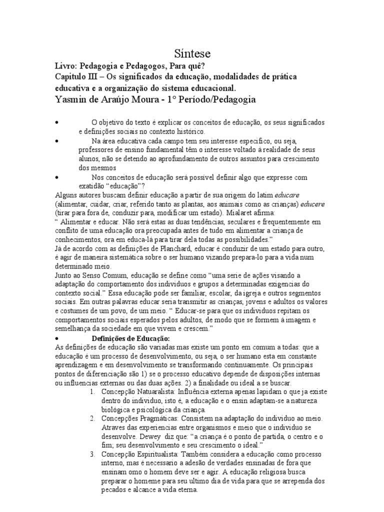Livro: Pedagogia e Pedagogos, Para qu? Capitulo III Os significados da educao, modalidades de prtica educativa e a organizao do sistema educacional.