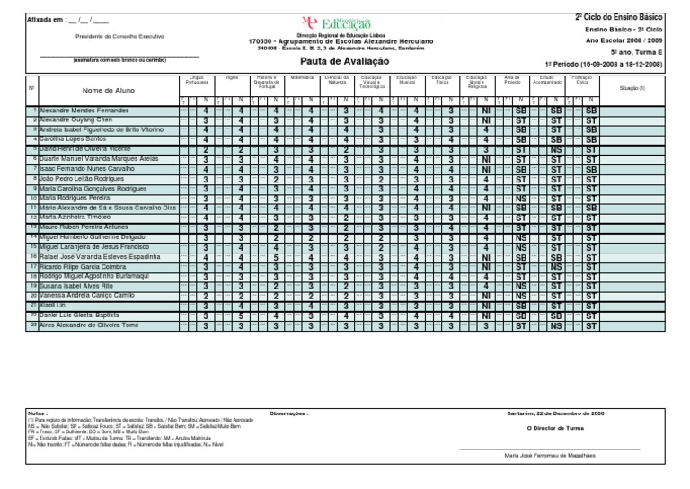 (assinatura com selo branco ou carimbo) Pauta de Avaliação 1º Período (16-09-2008 a 18-12-2008)