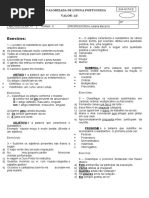 110 Ateu ............................................................ Ator ............................................................ 5) Siga o modelo: Se vi um cidado, tambm vi uma cidad. Quando vi o leo, tambm vi a ............. O hortelo e a ........................ trabalham. Ele se diz valento; ela, porm, ............ Encontrei o tabelio com a ...................... Quando despachou o cliente, entrou a .. Se h alfaiate, h tambm ...................... O hspede saiu e a .................... voltou. Ele meu parente; ela, minha ............... O feminino de oficial ............................. O feminino de juiz ................................. O feminino de bispo .............................. O feminino de visconde ....................... O feminino de cnsul ........................... 6) No texto que segue, classifique os substantivos destacados de acordo com o cdigo: a) substantivo prprio b) substantivo comum, concreto c) substantivo comum, abstrato A Rita matou nosso amor De vingana, nem herana deixou No levou um tosto Porque no tinha no Mas causou perdas e danos. (Chico Buarque de Holanda) 1. Rita 2. amor 3. vingana ( ) ( ) ( ) 4. tosto 5. perdas 6. danos ( ) ( ) ( ) belo beleza abolir abolio 1. menino ............................................. 2. magro ............................................... 3. covarde ........................................... 4. amargo ............................................. 5. moleque ........................................... 6. matar ................................................ 7. julgar ................................................ 8. reter .................................................. 8) Sublinhe o(s) substantivo(s) coletivo(s) que ocorre(m) nas frases e indique o(s) ser(es) a que ele(s) se refere(m): a) A frota britnica zarpou domingo da ilha de Ascenso, no Atlntico Sul (...) (Folha de S. Paulo) ................................................................... b) Desmantelada quadrilha que assaltava coreanos. (Dirio Popular) ................................................................... c) O museu possui o acervo mais completo da arte brasileira do sculo XIX. (Jornal do Brasil) ................................................................... d) A mudana mais importante do gabinete foi a nomeao do Ministro das Finanas (...) (Gazeta do Povo) ................................................................... 9) Permute o substantivo destacado pelo coletivo correspondente, fazendo as adaptaes necessrias: a) A presena de bfalos nas ruas centrais causou espanto. ...................................................................