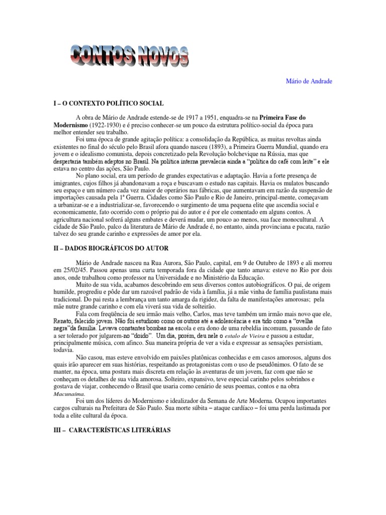 o (1922-1930) e preciso conhecer-se um pouco da estrutura poltico-social da poca para melhor entender seu trabalho. Foi uma poca de grande agitao poltica: a consolidao da Repblica, as muitas revoltas ainda existentes no final do sculo pelo Brasil afora quando nasceu (1893), a Primeira Guerra Mundial, quando era jovem e o idealismo comunista, depois concretizado pela Revoluo bolchevique na Rssia, mas que despertaria tambm adeptos no Brasil. Na poltica interna prevalecia ainda a poltica do caf com leite e ele estava no centro das aes, So Paulo. No plano social, era um perodo de grandes expectativas e adaptao. Havia a forte presena de imigrantes, cujos filhos j abandonavam a roa e buscavam o estudo nas capitais. Havia os mulatos buscando seu espao e um nmero cada vez maior de operrios nas fbricas, que aumentavam em razo da suspenso de importaes causada pela 1 Guerra. Cidades como So Paulo e Rio de Janeiro, principal-mente, comeavam a urbanizar-se e a industrializar-se, favorecendo o surgimento de uma pequena elite que ascendia social e economicamente, fato ocorrido com o prprio pai do autor e por ele comentado em alguns contos. A agricultura nacional sofrer alguns embates e dever mudar, um pouco ao menos, sua face monocultural. A cidade de So Paulo, palco da literatura de Mrio de Andrade , no entanto, ainda provinciana e pacata, razo talvez do seu grande carinho e expresses de amor por ela. II DADOS BIOGRFICOS DO AUTOR Mrio de Andrade nasceu na Rua Aurora, So Paulo, capital, em 9 de Outubro de 1893 e ali morreu em 25/02/45. Passou apenas uma curta temporada fora da cidade que tanto amava: esteve no Rio por dois anos, onde trabalhou como professor na Universidade e no Ministrio da Educao. Muito de sua vida, acabamos descobrindo em seus diversos contos autobiogrficos. O pai, de origem humilde, progrediu e pde dar um razovel padro de vida famlia, j a me vinha de famlia paulistana mais tradicional. Do pai resta a lembrana um tanto amarga da rigidez, da falta de manifestaes amorosas; pela me nutre grande carinho e com ela viver sua vida de solteiro. Fala com freqncia de seu irmo mais velho, Carlos, mas teve tambm um irmo mais novo que ele, Renato, falecido jovem. No foi estudioso como os outros at a adolescncia e era tido como a ovelha negrada famlia. Levava constantes bombas na escola e era dono de uma rebeldia incomum, passando de fato a ser tolerado por julgarem-no doido. Um dia, porm, deu nele o estalo de Vieira e passou a estudar, principalmente msica, com afinco. Sua maneira prpria de ver a vida e expressar as sensaes persistiam, todavia. No casou, mas esteve envolvido em paixes platnicas conhecidas e em casos amorosos, alguns dos quais iro aparecer em suas histrias, respeitando as protagonistas com o uso de pseudnimos. O fato de se manter, na poca, uma postura mais discreta em relao s aventuras de um jovem, faz com que no se conheam os detalhes de sua vida amorosa. Solteiro, expansivo, teve especial carinho pelos sobrinhos e gostava de viajar, conhecendo o Brasil que usaria como cenrio de seus poemas, contos e na obra Macunama. Foi um dos lderes do Modernismo e idealizador da Semana de Arte Moderna. Ocupou importantes cargos culturais na Prefeitura de So Paulo. Sua morte sbita ataque cardaco foi uma perda lastimada por toda a elite cultural da poca. III CARACTERSTICAS LITERRIAS