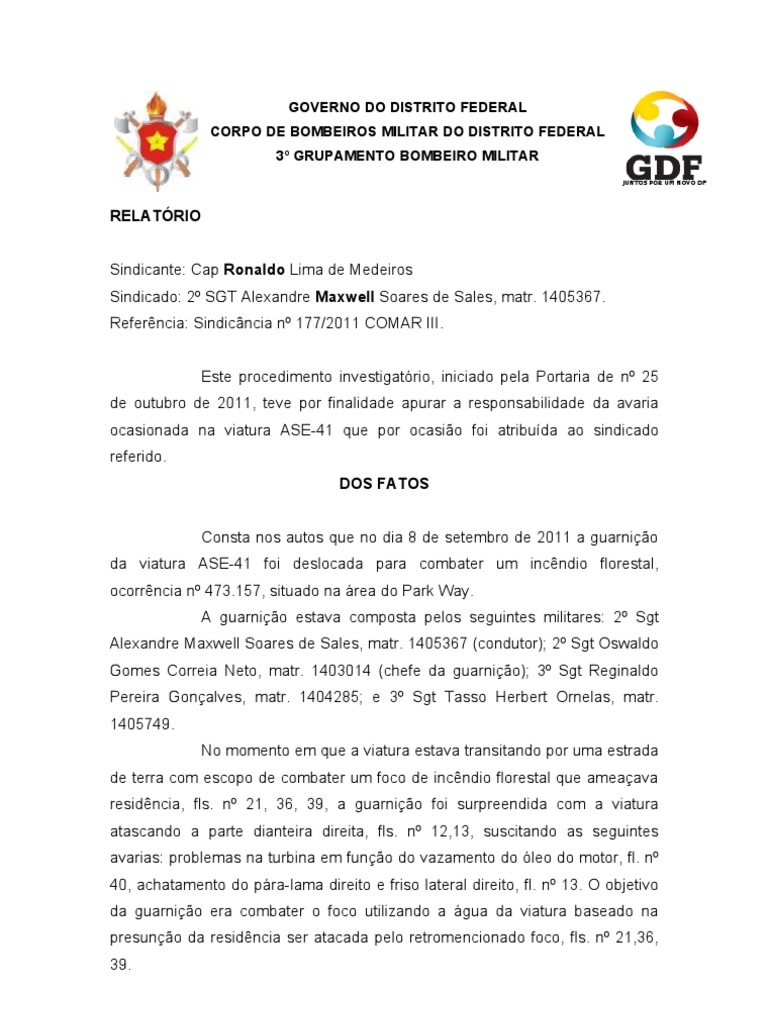 RELATRIO Sindicante: Cap Ronaldo Lima de Medeiros Sindicado: 2 SGT Alexandre Maxwell Soares de Sales, matr. 1405367. Referncia: Sindicncia n 177/2011 COMAR III. Este procedimento investigatrio, iniciado pela Portaria de n 25 de outubro de 2011, teve por finalidade apurar a responsabilidade da avaria ocasionada na viatura ASE-41 que por ocasio foi atribuda ao sindicado referido. DOS FATOS Consta nos autos que no dia 8 de setembro de 2011 a guarnio da viatura ASE-41 foi deslocada para combater um incndio florestal, ocorrncia n 473.157, situado na rea do Park Way. A guarnio estava composta pelos seguintes militares: 2 Sgt Alexandre Maxwell Soares de Sales, matr. 1405367 (condutor); 2 Sgt Oswaldo Gomes Correia Neto, matr. 1403014 (chefe da guarnio); 3 Sgt Reginaldo Pereira Gonalves, matr. 1404285; e 3 Sgt Tasso Herbert Ornelas, matr. 1405749. No momento em que a viatura estava transitando por uma estrada de terra com escopo de combater um foco de incndio florestal que ameaava residncia, fls. n 21, 36, 39, a guarnio foi surpreendida com a viatura atascando a parte dianteira direita, fls. n 12,13, suscitando as seguintes avarias: problemas na turbina em funo do vazamento do leo do motor, fl. n 40, achatamento do pra-lama direito e friso lateral direito, fl. n 13. O objetivo da guarnio era combater o foco utilizando a gua da viatura baseado na presuno da residncia ser atacada pelo retromencionado foco, fls. n 21,36, 39.