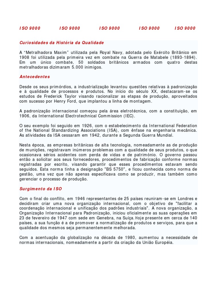 Curiosidades da Histria da Qualidade A Metralhadora Maxim utilizada pela Royal Navy, adotada pelo Exrcito Britnico em 1908 foi utilizada pela primeira vez em combate na Guerra de Matabele (1893-1894). Em um nico combate, 50 soldados britnicos armados com quatro destas metralhadoras dizimaram 5.000 inimigos. Antecedentes Desde os seus primrdios, a industrializao levantou questes relativas padronizao e qualidade de processos e produtos. No incio do sculo XX, destacaram-se os estudos de Frederick Taylor visando racionalizar as etapas de produo, aproveitados com sucesso por Henry Ford, que implantou a linha de montagem. A padronizao internacional comeou pela rea eletrotcnica, com a constituio, em 1906, da International Electrotechnical Commission (IEC). O seu exemplo foi seguido em 1926, com o estabelecimento da International Federation of the National Standardizing Associations (ISA), com nfase na engenharia mecnica. As atividades da ISA cessaram em 1942, durante a Segunda Guerra Mundial. Nesta poca, as empresas britnicas de alta tecnologia, nomeadamente as de produo de munies, registravam inmeros problemas com a qualidade de seus produtos, o que ocasionava srios acidentes com perda de vidas e de patrimnio. O governo passou ento a solicitar aos seus fornecedores, procedimentos de fabricao conforme normas registradas por escrito, visando garantir que esses procedimentos estavam sendo seguidos. Esta norma tinha a designao "BS 5750", e ficou conhecida como norma de gesto, uma vez que no apenas especificava como se produzir, mas tambm como gerenciar o processo de produo. Surgimento da ISO Com o final do conflito, em 1946 representantes de 25 pases reuniram-se em Londres e decidiram criar uma nova organizao internacional, com o objetivo de "facilitar a coordenao internacional e unificao dos padres industriais". A nova organizao, a Organizao Internacional para Padronizao, iniciou oficialmente as suas operaes em 23 de fevereiro de 1947 com sede em Genebra, na Sua. Hoje presente em cerca de 140 pases, a sua funo a de promover a normatizao de produtos e servios, para que a qualidade dos mesmos seja permanentemente melhorada. Com a acentuao da globalizao na dcada de 1980, aumentou a necessidade de normas internacionais, nomeadamente a partir da criao da Unio Europia.