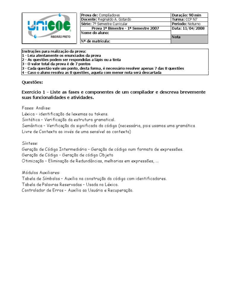 Questes: Exerccio 1 - Liste as fases e componentes de um compilador e descreva brevemente suas funcionalidades e atividades. Fases: Anlise: Lxica identificao de lexemas ou tokens. Sinttica Verificao da estrutura gramatical. Semntica Verificao do significado do cdigo (necessria, pois usamos uma gramtica Livre de Contexto ao invs de uma sensvel ao contexto) Sntese: Gerao de Cdigo Intermedirio Gerao de cdigo num formato de expresses. Gerao de Cdigo Gerao de cdigo Objeto Otimizao Eliminao de Redundncias, melhorias em expresses, ... Mdulos Auxiliares: Tabela de Smbolos Auxlio na construo do cdigo com identificadores. Tabela de Palavras Reservadas Usada no Lxico. Controlador de Erros Auxlio ao Usurio e Recuperao.
