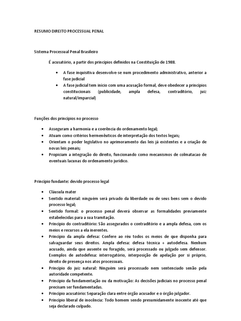 Princpio fundante: devido processo legal Clusula mater Sentido material: ningum ser privado da liberdade ou de seus bens sem o devido processo legal; Sentido formal: o processo penal dever observar as formalidades previamente estabelecidas para a sua tramitao. Princpio do contraditrio: So assegurados o contraditrio e a ampla defesa, com os meios e recursos a ela inerentes. Princpio da ampla defesa: Confere ao ru todos os meios de que disponha para salvaguardar seus direitos. Ampla defesa: defesa tcnica + autodefesa. Nenhum acusado, ainda que ausente ou foragido, ser processado ou julgado sem defensor. Exemplos de autodefesa: interrogatrio, interposio de apelao por si prprio, direito de presena nos atos processuais. Princpio do juiz natural: Ningum ser processado nem sentenciado seno pela autoridade competente. Princpio da fundamentao ou da motivao: As decises judiciais no processo penal precisam ser fundamentadas. Princpio acusatrio: Separao clara entre rgo acusador e o rgo julgador. Princpio liberal de inocncia: Todo homem sendo presumidamente inocente at que seja declarado culpado.